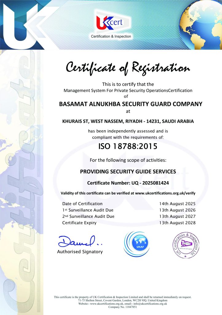 نحن في بصمة النخبة للحراسات الأمنية نلتزم بأعلى معايير الجودة والاحترافية في تقديم خدماتنا الأمنية. شهاداتنا وتراخيصنا الرسمية تؤكد التزامنا بالقوانين والمعايير الدولية لضمان سلامة منشأتكم ورضاكم الكامل.